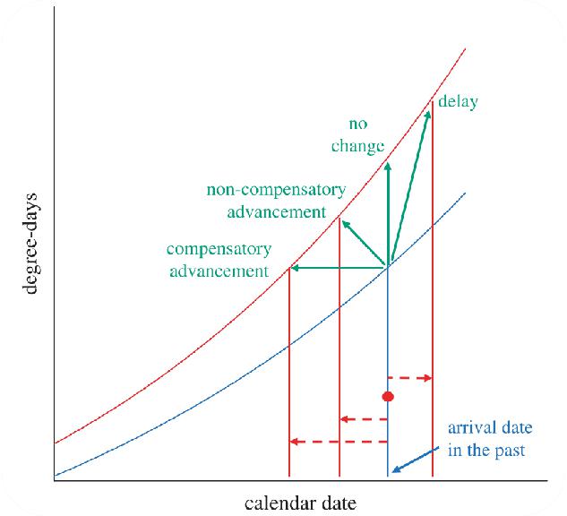相对气候和物候变化对候鸟生态错配的潜在影响。候鸟只有大幅提前到达日期才能完全弥补气候变化带来的影响 ( Saino et al. 2010 ) 。